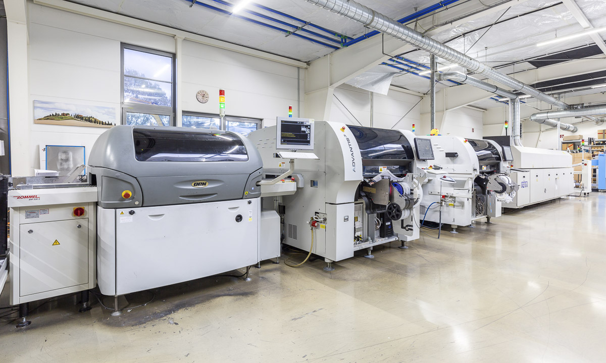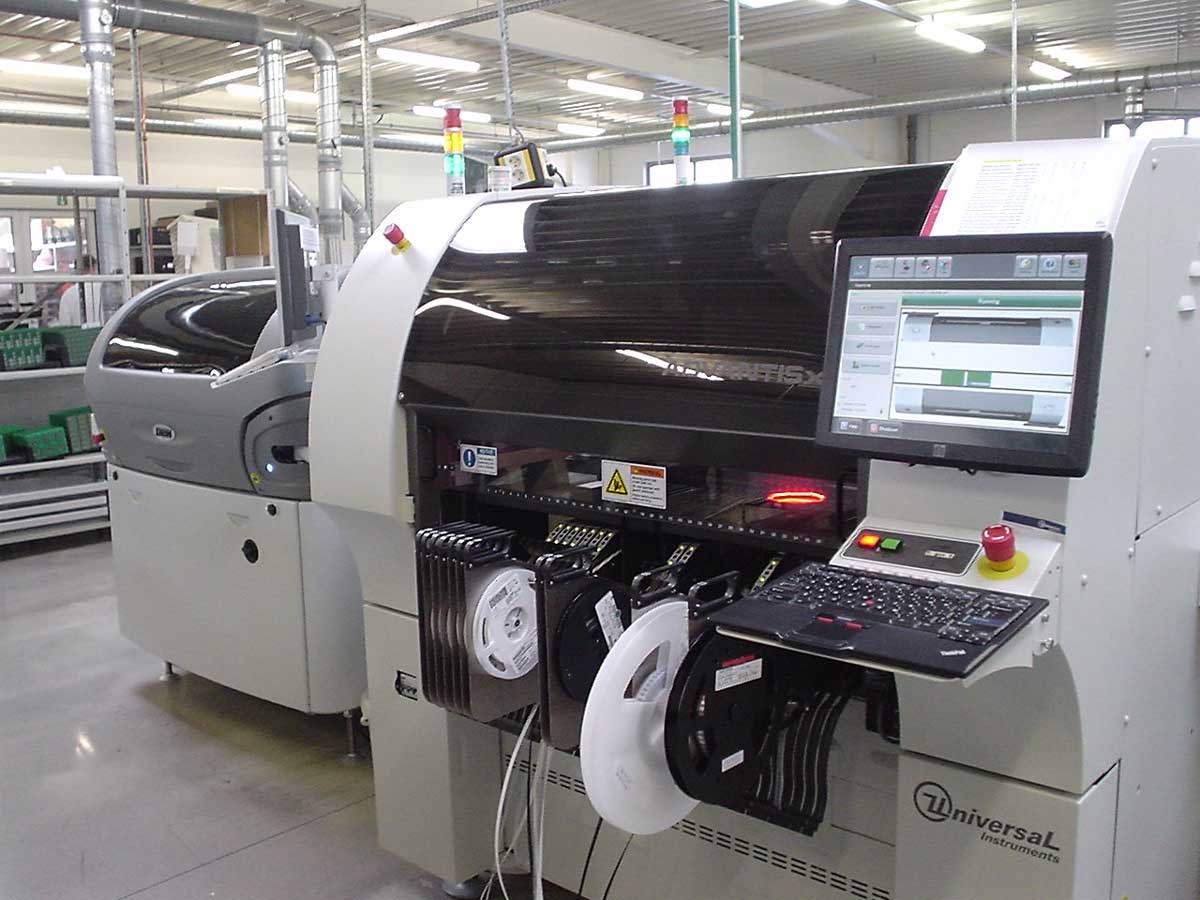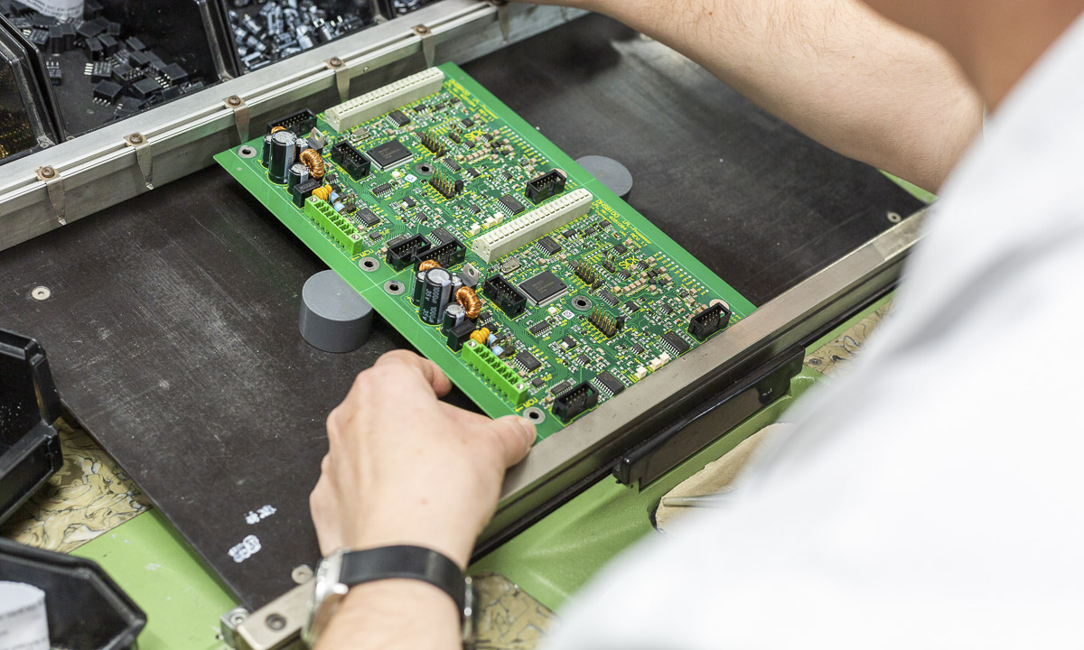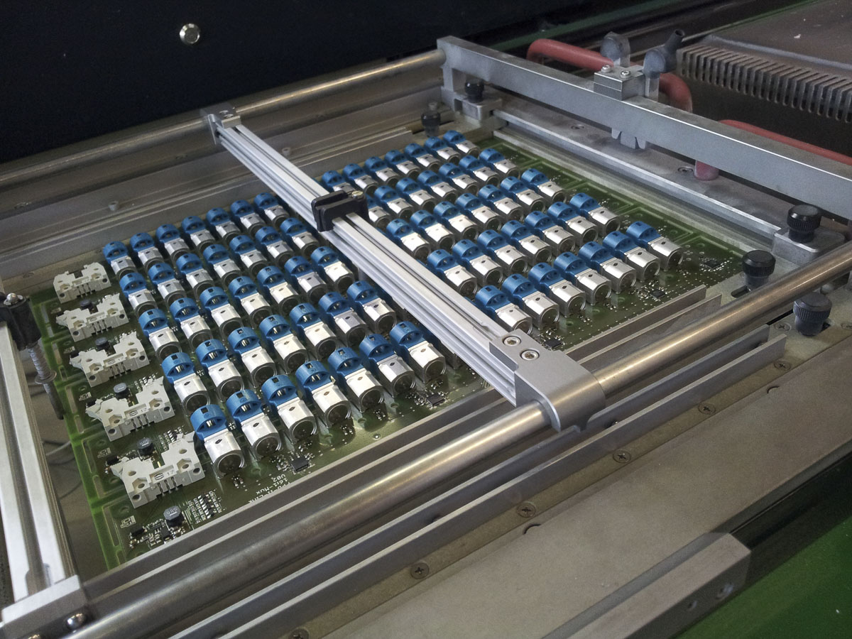 Die Bestückung gedrahteter Bauteile erfolgt manuell über Lichtpunkt-Bestücktische mit automatischer Bauteilzuführung und Positionskennzeichnung. Bauteilvorbereitungsanlagen, Pneumatikpressen zur Vormontage, zwei computergesteuerte Stickstoff-Lötanlagen sowie elektronisch geregelte Handlötstationen unterstützen unseren Fertigungsprozess.