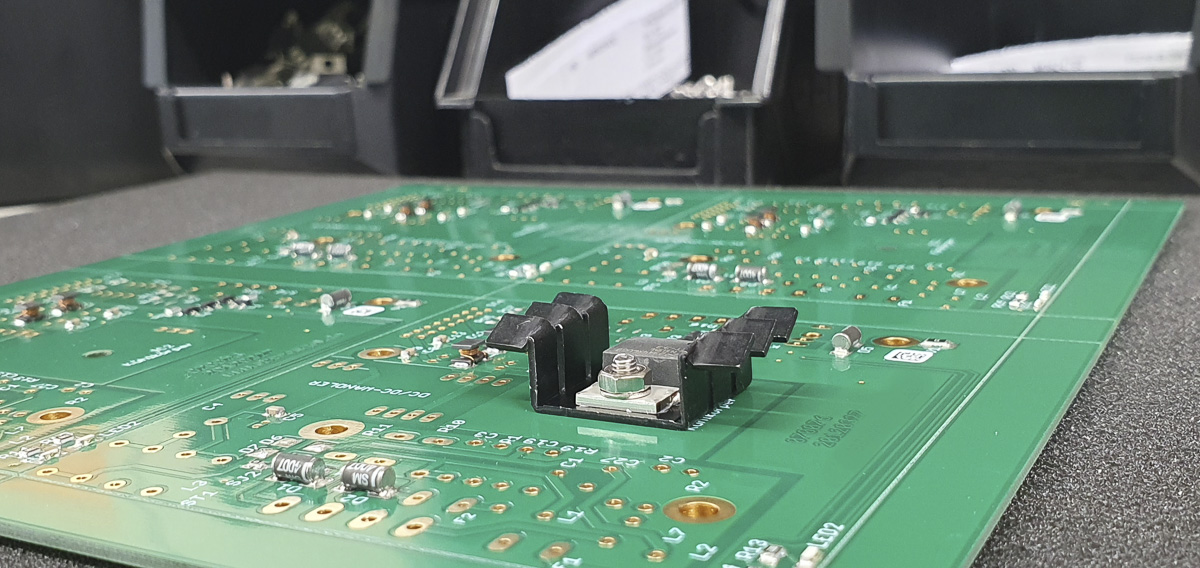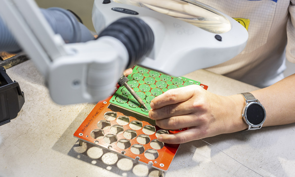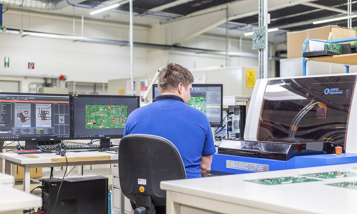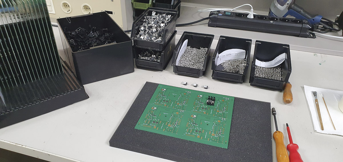 Die Bestückung gedrahteter Bauteile erfolgt manuell über Lichtpunkt-Bestücktische mit automatischer Bauteilzuführung und Positionskennzeichnung. Bauteilvorbereitungsanlagen, Pneumatikpressen zur Vormontage, zwei computergesteuerte Stickstoff-Lötanlagen sowie elektronisch geregelte Handlötstationen unterstützen unseren Fertigungsprozess.